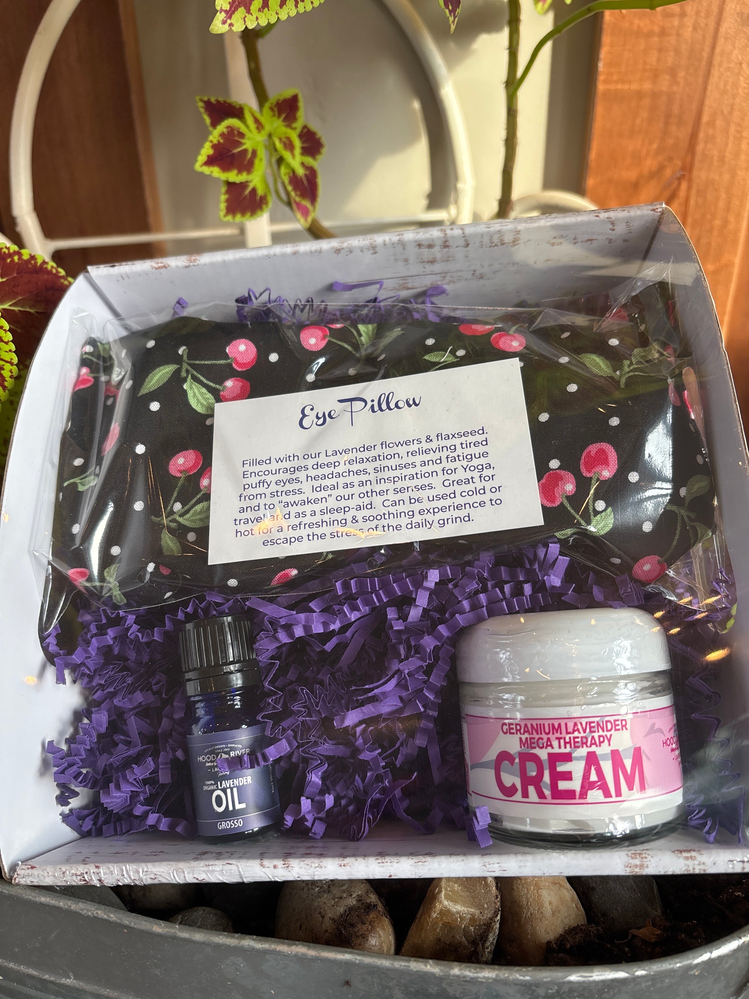 The Lavender Eye Pillow is filled with Lavender flowers, flax seed, and rice. Put in the microwave in 20 second increments to reach desired temperature. Then sit back, relax, and let the aroma surround you!